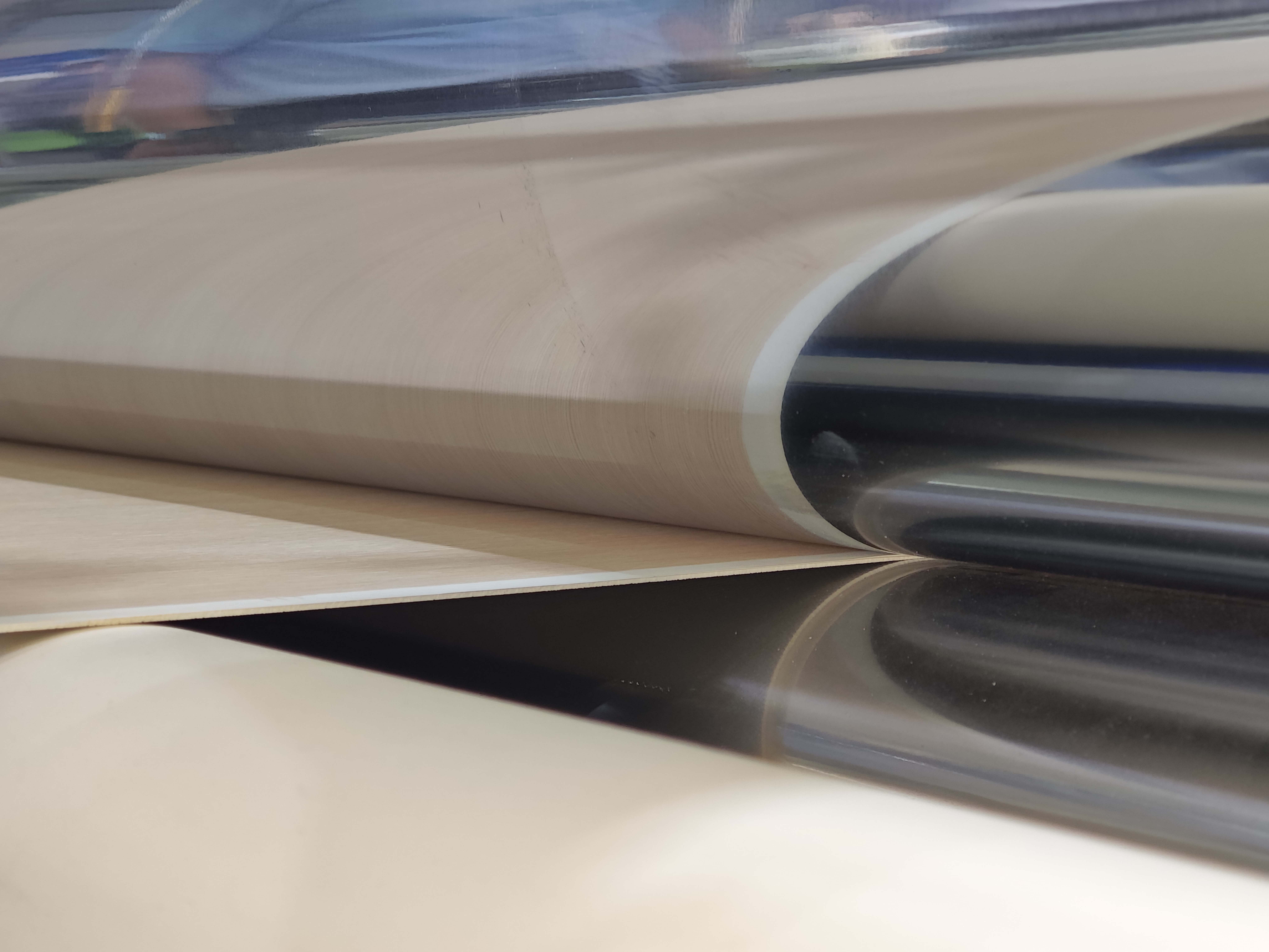 【涂飾仿真同步壓紋生產(chǎn)線】: SPC地板、PET地板可以采用設備實現(xiàn)精準定位,較傳統(tǒng)工藝提升5倍,圖案和紋理的天然仿真還原度達90%以上,以極低的成本,復刻實木地板的質感與紋理,產(chǎn)品品質不變,減少設備的投入,快速占領市場。